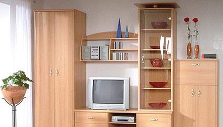 Мебельный комплект GERBOR для гостиной комнаты. Цветовая гамма: бук, ольха. В состав входят: шкаф 2-дверный, секция РТВ, бар, витрина.